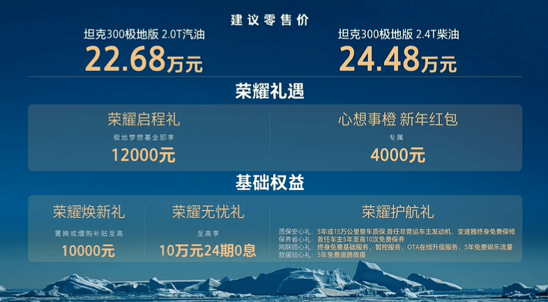 网易汽车12月11日报谈 本日晚间,(丨)极地版郑重上市,两个版块车型,2.0T汽油版市集蛊惑价22.68万,2.4T柴油价钱为24.48万。新车的推出主若是问候坦克300柴油版随“雪龙 2 号”南极科考之旅而来。在前不久的广州车展上,新车一经开启的预定,限量300台,15分钟一经售罄,而在本日的上市发布会上,官方又官宣候补渠谈一经开启,不错通过线崎岖订,新车将于本月下旬郑重录用。坦克300极地版共推出三套功能升级决策,进一步强化了其在脱落环境下的实用性与通过能力。